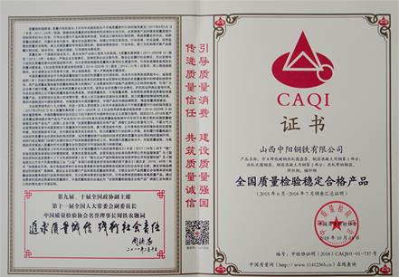 日前,凭借着优质的产品质量、完善的质量管理体系,中阳钢铁被中国质量检验协会授予“全国冶金行业质量领军企业”殊荣,中玉牌低碳钢热轧圆盘条、钢筋混凝土用热轧光圆钢筋、钢筋混凝土用热轧带肋钢筋、焊丝钢、锚杆钢等产品荣获“全国质量检验稳定合格产品”称号。