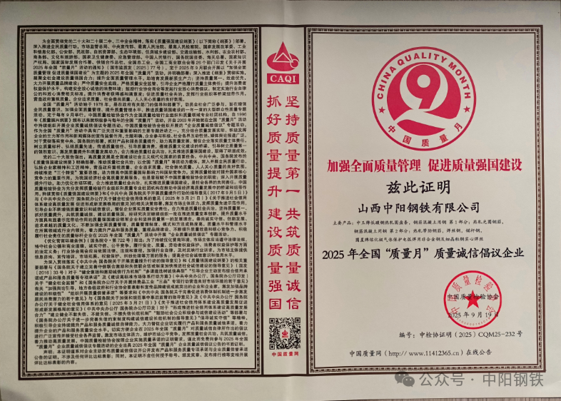 近日,在由市场监管总局、中央宣传部等26个部门共同部署开展的以“加强全面质量管理 促进质量强国建设”为主题的2025年全国“质量月”活动中,中阳钢铁凭借自身产品品质、企业经营与品牌信誉方面的卓越表现,荣获“质量诚信倡议企业”称号。